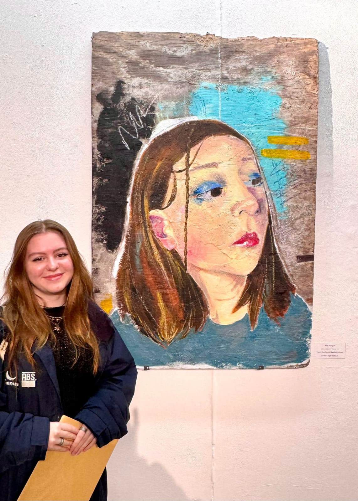 RHS Art Alumnus Nia Morgan, now studying Art at Cape Town University, with her prize winning entry at the Carmarthenshire School of Art, 2024